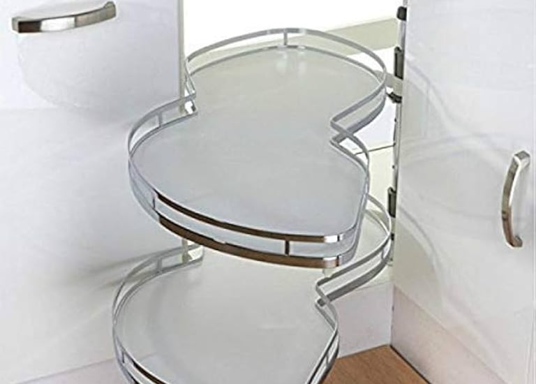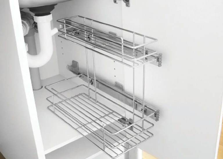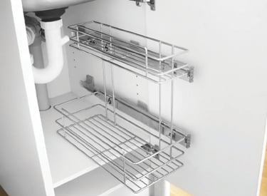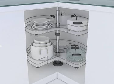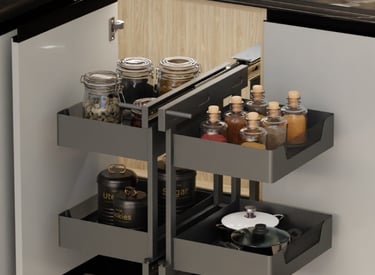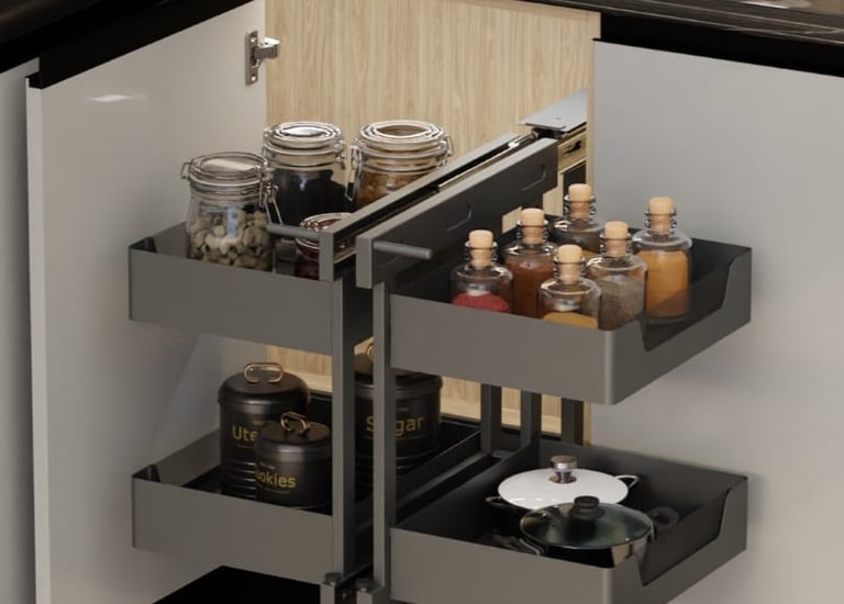 A smart pull-out system designed to utilize blind corner spaces efficiently, providing smooth access and better storage organization in modular kitchens.