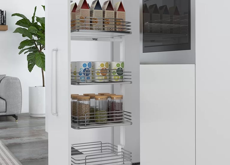 Slim pull-out units perfect for storing bottles, oils, and condiments efficiently.